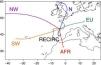 Caracterización de la carga de aerosoles en función de la trayectoriaLa trayectoria promedio de cada categoría aparece en la figura 3, habiendo recibido una denominación particular en función del área recorrida antes de llegar a Santander. Las trayectorias procedentes del océano Atlántico (NW y SW) son las más frecuentes (68%), como corresponde a un ámbito climático inmerso gran parte del año en el cinturón de vientos del Oeste (Westerlies). Su origen hace suponer una baja carga de aerosoles, con predominio del aerosol marino y una escasa carga antrópica. Por el contrario, las trayectorias EU (europea) y AFR (africana) recorren superficies continentales. La trayectoria N recorre áreas marítimas del Atlántico, si bien sus últimos tramos atraviesan las Islas Británicas y Francia. Por último, existe un pequeño número de trayectorias con una baja movilidad (RECIRC, recirculación), características del verano, resultado del intenso calentamiento de la meseta.