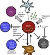 Las MDSC suprimen la función de células de la inmunidad innata y adaptativa mediante una variedad de mecanismos, entre ellos la liberación de ARGI y la reducción del TCRζ en linfocitos T CD4, CD8 y NK. Para mayor explicación, ver texto.