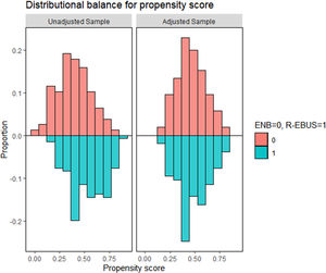Statistical analysisThe characteristics of the participants are presented as frequencies (%) and as means and standard deviations for categorical and continuous variables, respectively. To account for differences in pre-procedural patient and lesion characteristics between the ENB group and R-EBUS group, a propensity score model was generated using logistic regression.23 Information on propensity matching is available in the Supplementary Methods.