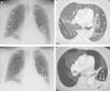 Presentamos el caso de una hemorragia intraquística pulmonar secundaria a anticoagulación en una paciente no fumadora de 59 años con afectación pulmonar quística grave asociada a una EDCL. La paciente consultó por disnea progresiva y dolor torácico, y entre sus antecedentes personales destacaban, además de la enfermedad pulmonar quística secundaria a EDCL (para la que se encuentra en lista de espera para un trasplante pulmonar), un mieloma múltiple diagnosticado 8 años antes y un síndrome nefrótico refractario a tratamiento esteroideo secundario a la EDCL. Una radiografía de tórax (fig. 1A) demostró múltiples imágenes quísticas en ambos pulmones de predominio subpleural (ya conocidas). Una angiotomografía computarizada (angio-TC) de tórax detectó un tromboembolismo pulmonar (TEP), además de la presencia de grandes lesiones quísticas subpleurales de paredes finas en todos los lóbulos (descritas en estudios previos) atravesadas de vasos pulmonares (fig. 1B). Cuatro semanas después del inicio del tratamiento anticoagulante, la paciente presentó un episodio de dolor torácico izquierdo y un esputo hemoptoico, detectándose en la radiografía de tórax la aparición de un nivel hidroaéreo en la base pulmonar izquierda (fig. 1C). Una tomografía computarizada (TC) de tórax confirmó la presencia de un nivel hidroaéreo en el interior de una lesión quística del lóbulo inferior izquierdo (fig. 1D). La densidad elevada del componente líquido intracavitario sugería un sangrado reciente. Se procedió a embolizar con partículas de gelfoam las ramas arteriales pulmonares que rodeaban la formación quística sangrada, mejorando la sintomatología de la paciente.