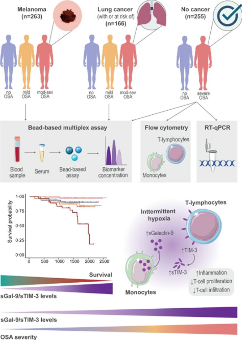 ResultsIn severe OSA patients with melanoma or lung cancer, sGalectin-9 and sTIM-3 were associated with tumour aggressiveness and with an increased mortality risk. In the three study cohorts, biomarker levels were higher in severe OSA patients than in the other groups. In non-cancer OSA patients’ monocyte intracellular Galectin-9 and T-lymphocyte membrane-bound TIM-3 were upregulated. Experimental data revealed that intermittent hypoxia drove the expression of these biomarkers, which were positively associated with inflammatory mediators and inversely related to T-cell proliferation and infiltration. These findings underscore a mechanistic link between hypoxemia and immune suppression.