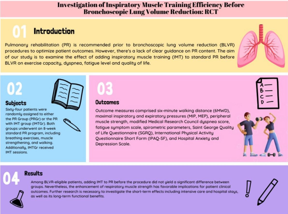 ConclusionIn conclusion, our study sheds light on the potential benefits of integrating IMT into standard PR programs, particularly for enhancing respiratory muscle strength. However, it's noteworthy that our findings did not reveal a significant difference between the IMT and PR-alone groups in terms of exercise capacity or other patient-reported outcomes. This suggests that while IMT integration holds promise, its additional benefits over standard PR alone may not be statistically significant based on our study results. Nonetheless, our study underscores the positive effects of PR on the clinical status of BLVR-eligible patients, consistent with existing literature. This reaffirms the value of PR as a standalone intervention in optimizing patient outcomes in this population. Furthermore, our results emphasize the importance of PR as a precursor to BLVR procedures, indicating its role in optimizing patient outcomes. Nevertheless, it's important to acknowledge the limitations of our study, particularly its ability to detect significant differences between groups. Therefore, further research with larger sample sizes is warranted to fully elucidate the potential benefits of IMT integration and PR preceding BLVR. Such research could provide valuable insights into optimizing patient care and treatment strategies.