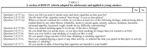 Given the lack of studies that quantify nicotine dependence in young smokers under the DSM-IV criteria, we decided to evaluate the usefulness of a version with language adapted to be more comprehensible to adolescents (DSM-IVa) in the diagnosis of nicotine dependence. We also aimed to assess nicotine dependence in young smokers using this criteria and to specify the most important items with which to evaluate this dependence in students.