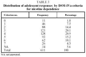 To conclude, the DSM-IVa version of the DSM-IV criteria for nicotine dependence adapted for adolescents is useful in the studied population, although not perfect. According to this version, 70.7% of young smokers between 10 and 17 years old have already become nicotine dependent, the key questions being those referring to the presence of withdrawal syndrome and the need to spend a large part of free time obtaining and smoking cigarettes. Consequently we consider that research should continue to look for a system for assessing nicotine dependence in this population, whose smoking is so unique both quantitatively and qualitatively.