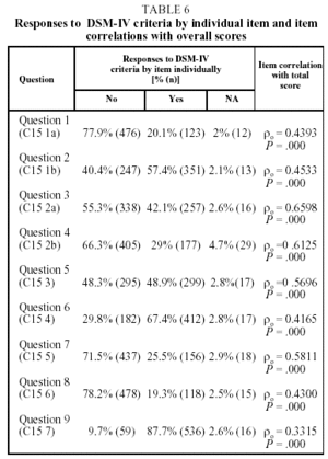 The results for each item on the DSM-IVa are shown in Table 6. The item that received an affirmative answer most frequently was question 9 (C15 7), to which almost 90% (87.7% of the smokers) agreed that they smoke in spite of knowing that cigarettes damage their health; the next item most frequently answered affirmatively was criterion C15 4 (question 6), to which 67.4% reported that they wished to stop smoking or had tried to stop at some point. The items that correlated best with the total DSM-IVa score and that therefore most affected the final score, were C15 2a and C15 2b, (Δo=0.6598 and Δo=0.6125, respectively); these items are those related to the presence of withdrawal syndrome. However, it should be pointed out that the correlation, in general, was low but quite uniform, with rho values between 0.3315 and 0.6598.