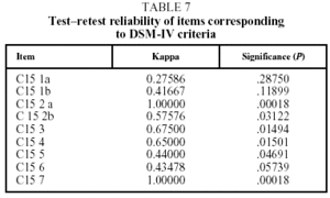 The internal consistency of the DSM-IVa was good according to Cronbach's alpha (α=0.5598). However, the correlation amongst the criteria according to the Kendall tau coefficient was low, which suggests that all of the questions are important for the diagnosis of dependence. The strongest correlations were between criteria C15 A (C15 2a and C15 2b) and C15 5 (Φ=0.3408), referring to the presence of withdrawal syndrome symptoms and the time spent smoking or obtaining cigarettes, respectively. As can be observed in Table 7, the test-retest reliability of the items was moderate, varying greatly from one item to another; items C15 2a and C15 7 were those for which agreement was best (100%).