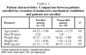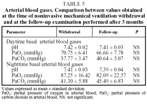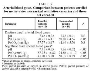 In regard to the clinical course of individual patients in the study as revealed at a follow-up examination carried out 3 months later, only one had experienced a deterioration in symptoms and basal arterial gases that made it necessary to reintroduce NPPV. Finally, in 11 patients, 50% of those initially evaluated and 92% of those who were withdrawn from NPPV were able to remain free of ventilatory support.