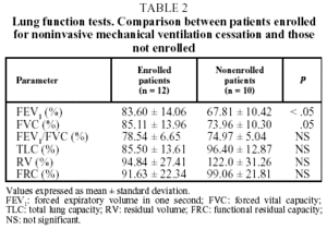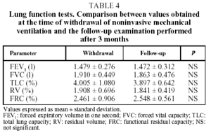 An obvious limitation to the study presented here is the small number of patients enrolled. It is prob able that a larger sample size would have made it possible to detect significant differences in some variables. Even so, the proportion of subjects we found able to do without mechanical ventilation 3 months after its cessation has, in and of itself, clinical relevance. Another limitation of the present study is the short follow-up period after NPPV withdrawal. Analysis after 3 months may only reflect an intermediate phase between the decrease in hypercapnic ventilatory response and the reappearance of respiratory insufficiency. This makes us consider the work we are presenting a preliminary study that requires a longer follow-up period to determine whether the withdrawal of ventilation can be maintained definitively or, to the contrary, whether all of the patients would end up returning irremediably to the situation they were in prior to beginning ventilation support.