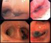 Case 2An 88-year-old male from the Spanish Balearic Islands, with no toxic habits, who had worked as a silversmith using coal to melt down silver. He was admitted for pneumococcal pneumonia in the left lower lobe. Treated with levofloxacin, he showed a clear clinical improvement, but there was partial atelectasis in the left lower lobe. Thoracic CT demonstrated a mass/infiltrate with total atelectasis of the left segment 6 and partial atelectasis of the left lower lobe and the lingula. Bronchoscopy (Fig. 2) showed millimetric blackish-purple maculae that were anthracotic in appearance in the bilateral segmental and lobar bronchi, with subtotal stenosis of the lumen of the left lower lobe due to blackish-purple nodules. Histology revealed chronic acute inflammation with local fibrosis and anthracotic deposit, with no evidence of malignancy or pathogens. Bronchoscopy was repeated 2 months later, with the same results. Tuberculosis bacilli were not isolated, and therefore specific treatment was not started.