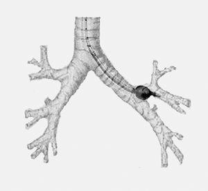 Fig. 2. Colocación del bloqueador endobronquial en el bronquio intermediario, en el caso 1. (Figura diseñada por C. Ibáñez.)
