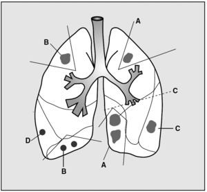 Fig. 1. Esquema que muestra las diferentes resecciones atípicas y la lobectomía antes de la lobectomía inferior izquierda en el caso 1. A: resecciones atípicas izquierdas de los lóbulos superior e inferior en enero de 2002.B: resecciones atípicas de los lóbulos superior e inferior derechos en febrero de 2002. C: lobectomía del lóbulo inferior izquierdo en agosto de 2002.D: diagnóstico de nuevo nódulo en febrero de 2004. (Figura diseñada por C. Espí.)