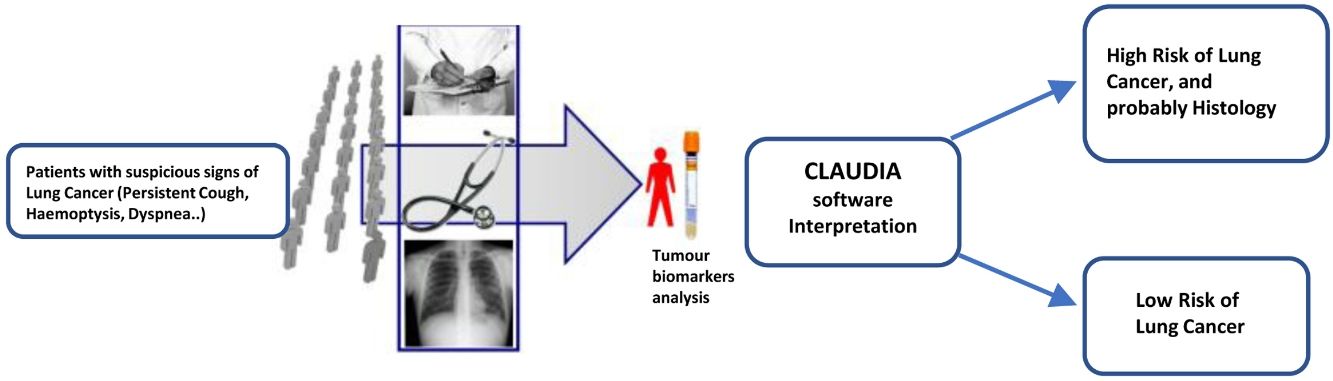Diagnostic tools that stratify lung cancer (LC) risk can help prioritize care for patients at the highest risk and optimize time and procedures to achieve the final diagnosis. We have previously demonstrated that six tumour biomarkers (TBs) – CEA, CYFRA 21.1, CA 15-3, SCC Ag, ProGRP, and NSE – can help assess LC risk. We developed expert software that combines these TBs with clinical and imaging data to estimate LC risk.