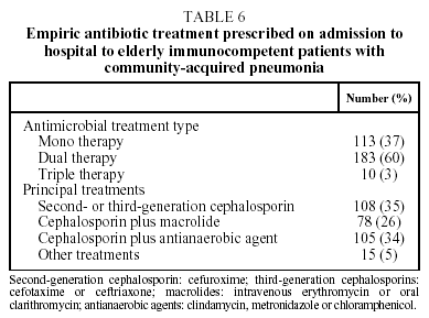 On admission to hospital, most patients were either treated with a single antibiotic (mono-therapy, 37%) or received dual therapy (60%). The mean number of antibiotics administered was 1.5 (0.8) (range 13). A total of 97% of the patients were treated with second- (cefuroxime in 84 cases) or third-generation (cefotaxime or ceftriaxone in 213 cases) cephalosporins (Table 6). In 27% of the patients, macrolides were administered concurrently (oral clarithromycin or intravenous erythromycin) to cover atypical pathogens (M. pneumoniae, Chlamydia pneumoniae, Legionella sp). One third received anti-anaerobic cover (clindamycin, metronidazole or chloramphenicol) due to decreased consciousness and/or suspected aspiration. Failure to follow the American Thoracic Society guidelines on admission to the hospital was a factor of bad prognosis (P<.005). Furthermore, the use of second- and third-generation cephalosporins in conjunction with anti-anaerobic agents on admission was associated with an increase in the complication rate and a higher in-hospital mortality rate (P<.001). However, this finding was not significant in the multivariate analysis because these antimicrobial treatments were used particularly in the patients whose condition was the most severe (Fine´s classes IV and V). On the contrary to what is described in the literature,24 the use of macrolides was not associated with a more favorable outcome and a lower risk of death.