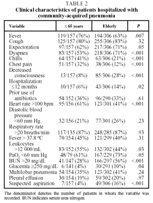 The main objectives of this study were to describe the clinical and radiographic features, etiology, prognostic factors and course of the disease in elderly patients with community-acquired pneumonia. CAP is the principal cause of death from infection in the elderly population, and constitutes a serious public health problem. The incidence of CAP in the elderly is higher than that observed in the young population, and it is a common motive for visits to emergency departments and for hospital admission. In our study, a high proportion of the elderly patients hospitalized for CAP were over 80 years old (53%), were suffering from concurrent diseases (in particular cardiovascular or chronic neurological diseases, diabetes mellitus, COPD, chronic renal failure and/or neoplastic disease), and corresponded to Fine´s risk classes IV and V (approximately 80%). It is important to note that almost half of the elderly adults were admitted to the intermediate or intensive care unit owing to the severity of their respiratory infection. Although this figure seems high compared to the situations described in other countries (10%-30%),3,10-13,17,19,25 mortality in the intermediate and intensive care units was 3-4 times that of patients admitted to the general wards, indicating that the patients admitted to these units really were the most serious cases. Mean length of stay in hospital was around 10 days, and in-hospital mortality was around 10%, similar to the figure given for other countries in the literature.1-3,10-13,15-19,25
