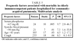 Consistient with what is described in the literature,1,3,10-15,19,23,24 the predictive factors of death from CAP in the univariate analysis were advanced age (>83 years), neurological comorbidity, suspected aspiration, short clinical history (<3 days), absence of cough, arterial hypotension, tachypnea, metabolic acidosis, hypoxemia, hypocapnia, raised serum urea nitrogen, radiographic evidence of multilobar disease, Fine´s risk class V, the use of two or three antibiotics at the time of admission, failure to follow the American Thoracic Society clinical guidelines,19 admission to the intensive care unit, and the need for mechanical ventilation. Some prognostic factors on admission not previously reported in the literature where hypernatremia, hyperkalemia, hyperphosphoremia and hypoalbuminemia; these findings were probably related to the severity of the infection and the underlying health status of the patients. In multivariate analysis, the following variables were still associated with a greater risk of death, independently: advanced age, systolic hypotension and raised serum phosphorus; while the presence of cough constituted a protective factor. These prognostic factors evaluated on admission to the hospital were also described by Fine et al in their meta-analysis of prognostic factors in CAP,13 which examined some 122 clinical studies on the subject. The risk factors with respect to hospitalization proposed by the American Thoracic Society19 and associated with slow clinical response and death include those described in this study: >65 years of age, comorbidity, arterial hypotension, tachypnea, hypoxemia, metabolic acidosis, deterioration of renal function and multilobar disease. This validates in our environment what has been reported in foreign literature.