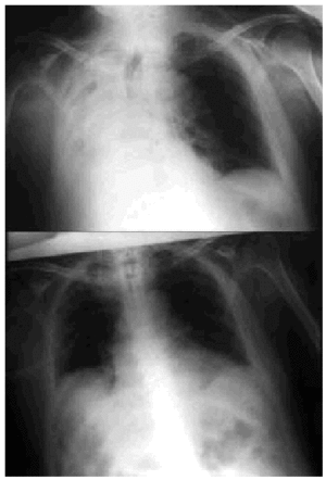 Fig. 5. Right-sided atelectasia in a patient with very advanced Alzheimer's disease who was unable to achieve an effective cough. After 6 hours of mechanical insufflation-exsufflation therapy and oronasal mask (every 15-30 minutes), and without any self-assistance, the atelectasia disappeared.