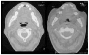 Fig. 6. Computerized axial tomography scans showing the difference inpermeability of the upper airways during an insufflation maneuver withthe Emerson Coflator and during exsufflation in a patient withamyotrophic lateral sclerosis and bulbar dysfunction.