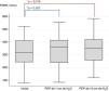 La prueba de la F del criterio de valoración principal (PM6M-D) muestra una diferencia significativa en los resultados obtenidos con los diferentes niveles de PEP y la situación inicial (prueba de la F: 0,02). El análisis retrospectivo muestra que el uso de PEP1 y PEP10 aumentó la distancia recorrida (PEP1: p<0,002; PEP10: p<0,018), en comparación con la situación inicial. No se observaron diferencias significativas entre PEP1 y PEP10. En la figura 2 se presentan los diagramas de cajas de la PM6M-D.