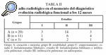 Recibieron tratamiento corticoide 14 (70%) pacientes del grupo A, 9 (81,8%) del grupo B y 3 (100%) del grupo C. No se encontraron diferencias estadísticas en relación con la evolución entre los pacientes que recibieron tratamiento corticoide y los que no lo recibieron (p = 0,32). Por estadios radiológicos de presentación no se encontraron diferencias estadísticas en la evolución de los pacientes según hubieran recibido o no tratamiento con corticoides (estadio I, p = 0,24; estadio II, p = 0,75; estadio III, p = 0,80).