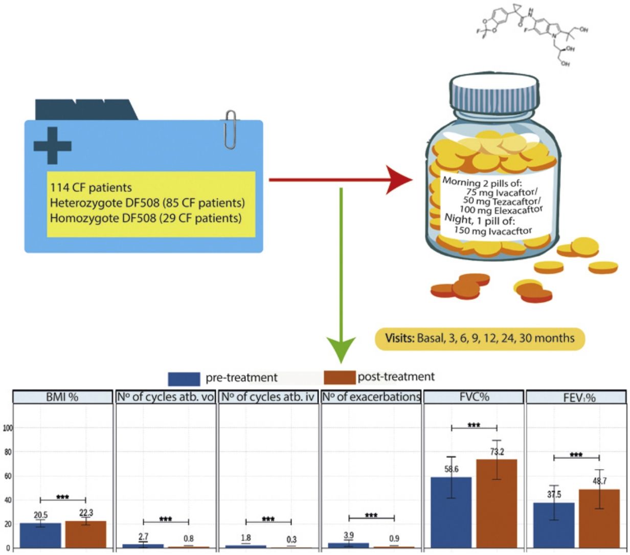The strengths of our study include a large number of patients, multicenter, a long follow-up period of 30 months and an analysis of previously unevaluated aspects such as microbiology, differences between homo- and heterozygous F508del groups and the assessment of factors related to FEV1% improvement in this patient profile with advanced disease.