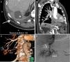 A) Imagen axial de la TC de abdomen en la que se observa una colección subfrénica derecha (asterisco). Nótese la presencia de cambios inflamatorios en el seno costofrénico derecho (flecha). B) Reconstrucción proyección de intensidad máxima (MIP) coronal de la angio-TC de tórax y abdomen superior en la que se visualiza una comunicación entre una arteria frénica inferior derecha hipertrófica (flecha negra) y una arteria subsegmentaria pulmonar del lóbulo inferior derecho (flecha blanca). C) Reconstrucción volumétrica (volume rendering) de la angio-TC de la fístula sistémico pulmonar (las flechas cortas señalan la arteria frénica inferior derecha mientras que las largas señalan la arteria pulmonar). D) Arteriografía en la que se visualiza el llenado retrógrado de las arterias pulmonares (flechas largas) desde la arteria frénica inferior derecha hipertrófica y tortuosa (flechas cortas).