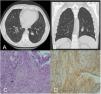 (A, B) Computed axial tomography scan of the thorax, axial and coronal views showed a round, well delineated, 2.2cm nodule in the posterior segment of the left lower lobe. (C) Lung biopsy (haematoxylin and eosin stain; ×10) fusocellular and fasciculated stromal proliferation that traps pre-existing mucous-secretory glands. Characteristic histological features include cellular Antoni A. (D) Tumour cells were immunoreactive to S100.