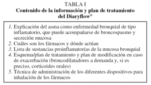 Un médico de asistencia primaria citó telefónicamente a los pacientes, a un ritmo de 8 por semana, para que se visitara a 4 de ellos en 2 días diferentes. Una vez en el CAP, los pacientes eran atendidos por uno de los 2 neumólogos que participaron en el trabajo de campo, ambos ajenos al centro, quienes realizaban el protocolo de estudio, que consistía en: a) interrogatorio sobre la profesión de los pacientes, hábito tabáquico, consumo de alcohol y otras drogas, cuidado o no de animales en su domicilio, manifestaciones alérgicas además del asma (rinitis, conjuntivitis, eccema, urticaria) y resultado de las pruebas cutáneas de hipersensibilidad inmediata o determinación de inmunoglobulinas E específicas en suero, si una o ambas pruebas se habían realizado anteriormente; b) se les preguntaba asimismo si habían recibido una explicación sobre su enfermedad, si se les había administrado un plan escrito de tratamiento y si realizaban de algún modo un seguimiento de su enfermedad, además de preguntarles sobre el tratamiento que realmente venían realizando y comprobar el grado de control del asma según los síntomas (tos, sibilancias, disnea y medicación de rescate utilizada), frecuentación al médico y a los servicios de urgencias, y pérdida de días de trabajo en los 4 meses anteriores; c) se practicaba una espirometría; d) se calificaba la gravedad del asma según la normativa GINA12, es decir, por síntomas previos y en el momento de la visita, y e) finalmente se ajustaba la medicación por escrito según la gravedad de la enfermedad, además de instruir a los pacientes sobre las modificaciones a realizar en caso de empeoramiento (aumento de los betamiméticos de rescate y, en el caso de mejorar, introducción de una tanda corta de corticoides orales) y explicarles en 5 min en qué consiste la enfermedad asmática. El total de tiempo utilizado en la primera visita fue de 30 min. La explicación sobre la enfermedad se realizó siguiendo el cuaderno Diaryflow®, de utilización habitual en nuestro servicio, que contiene, con figuras explicativas, etc., las informaciones enumeradas en la tabla I.