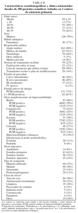 De los 230 pacientes con quienes se estableció contacto telefónico, acudieron a consulta 192 (83%). De éstos, se confirmó el diagnóstico de asma en 180, quienes se estudiaron en la primera visita. En la tabla II se describen las características basales de los pacientes, de los que un 70% eran mujeres y un 42% tenía más de 60 años. Un 17% eran fumadores habituales. Un 46% únicamente había cursado estudios primarios y un 8% eran analfabetos. Un 75% eran o habían sido trabajadores manuales. Se habían realizado pruebas cutáneas de hipersensibilidad inmediata 131 pacientes (73%), y 82 (63%) de éstos manifestaron que habían sido positivas frente al menos un antígeno. Un gran porcentaje refería haber presentado otras manifestaciones de alergia, encabezadas por rinitis (46%) y conjuntivitis (42%). Un 11% de los pacientes afirmaba haber presentado una reacción clínica significativa o grave frente al ácido acetilsalicílico. Como era de esperar, el 90% de los pacientes manifestaban estar controlados por un médico del Institut Català de Salut, el 51% directamente por el médico de familia y un 44% por el neumólogo. Un 8% estaban controlados por un médico privado (mutua u otro tipo). Sólo 2 pacientes declararon realizar tratamiento con medicina alternativa. Un 22% refería haber recibido explicaciones sobre la enfermedad asmática y un 50% aseguraba no tener el tratamiento por escrito. Sólo un 14% tenía un plan a realizar en caso de agudización de la enfermedad. La presión arterial media en los 114 pacientes, una vez excluidos aquéllos con presión arterial sistólica > 140 mmHg y/o con presión arterial diastólica > 90 mmHg, fue de 119 ± 9 mmHg/73 ± 6 mmHg.