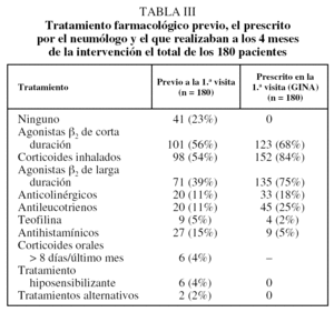 En cuanto al tratamiento que realizaban los pacientes (tabla III), se comprueba que, a pesar de la existencia de normativas para el tratamiento del asma, los pacientes no reciben el recomendado por dichas normativas. Debido a que, según el protocolo, la pregunta se refería a la "medicación que de verdad está tomando", no podemos discriminar en qué porcentaje este incumplimiento se debe a la falta de prescripción o al deficiente cumplimiento terapéutico. La actuación realizada por el neumólogo sirvió para adaptar la medicación a la recomendada en las normativas. Debemos resaltar que al adaptar la medicación a las normativas se incrementa, lógicamente, la cifra de corticoides inhalados y de betaestimulantes de efecto prolongado, lo que en muchos casos se deberá al uso de las combinaciones existentes en el mercado. Este hecho abre el interrogante de qué va a suceder en los próximos años al utilizar durante largo tiempo aquellos betaestimulantes de larga duración, cuyo uso, según se ha comunicado, implica un mayor aumento de las agudizaciones graves23,24, efecto que, sin embargo, no ha corroborado un reciente estudio25. Además, después del reciente estudio de Boushey et al26, en el que, en los pacientes con asma leve persistente (en nuestro estudio, el 49% del total), no se demostraron diferencias en el control de la enfermedad a lo largo de un año entre los que recibieron corticoides inhalados de modo continuado, tal como recomiendan las guías, frente a los que únicamente los usaron en caso de presentar empeoramiento, el uso continuado de este fármaco en este estadio está algo más cuestionado27. En nuestro estudio es asimismo destacable la gran cantidad de pacientes (25%) a los que, aplicando las normativas internacionales, el neumólogo prescribió antileucotrienos; dicha prescripción puede estar influida, por un lado, por la gran frecuencia de rinitis asociada (46%) y, por otro, por el hecho de haberse prescrito dichos fármacos como alternativa en los pacientes que no realizaban el tratamiento inhalado de forma adecuada.