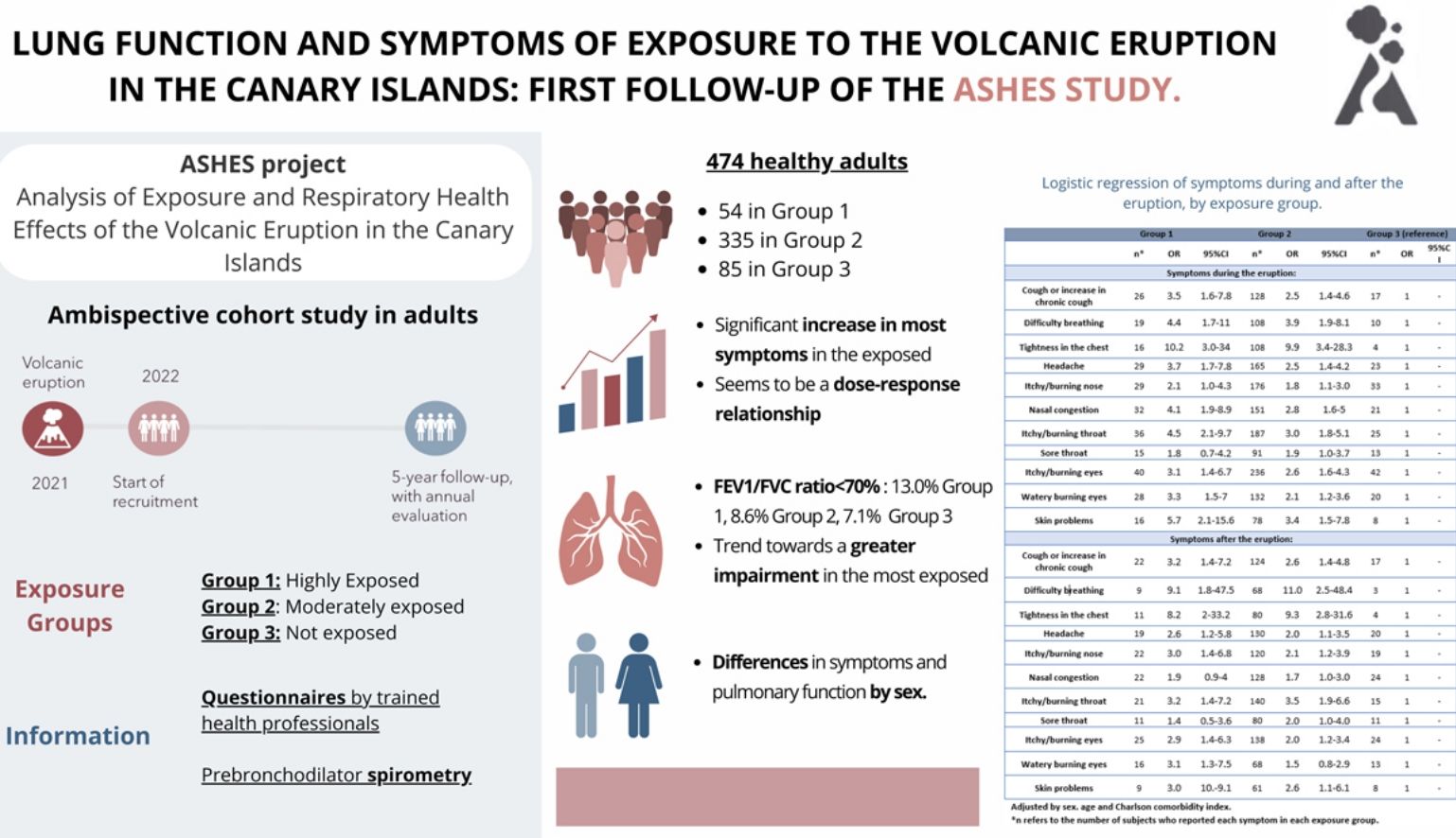 Exposure to gases and particulate matter released during volcanic eruptions can prove harmful to population health. This paper reports the preliminary results of the ASHES study, aimed at ascertaining the respiratory health effects of the 2021 volcanic eruption in La Palma Island (Spain) on the adult population without previous respiratory disease.