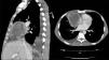 Pleuropericardial cyst is an uncommon lesion that occurs at an incidence of 1 in 100,000 cases. It is normally located in the mid-mediastinum, and is often asymptomatic and found by chance,1 but it may be complicated by compression from adjacent structures,2 infection or bleeding from the cyst itself.1 Treatment is conservative, and surgical treatment is reserved for symptomatic cases. In our patient, both the form of presentation (infection) and the site (anterior) are unusual.