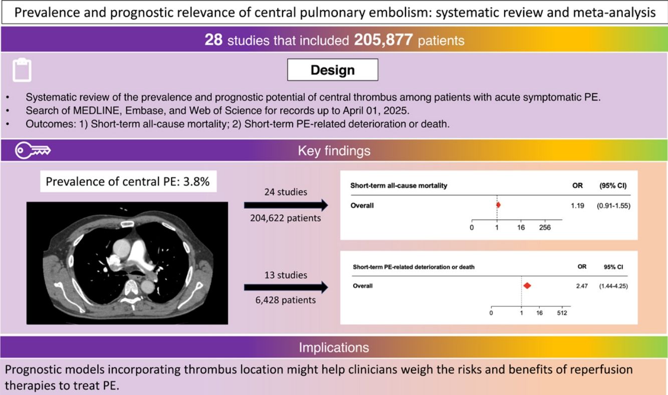 ResultsData from 28 studies (205,877 patients) were included in the analysis. Of the 26 studies with 205,410 participants that enrolled consecutive patients with PE, 7748 (3.8%) had central PE. Though there was no statistically significant difference between central and noncentral PE for odds of short-term all-cause mortality (odds ratio [OR] 1.19; 95% confidence interval [CI], 0.91–1.55), central PE had a significant association with short-term PE-related deterioration or death (OR, 2.47; 95% CI, 1.44–4.25). Results from 9 studies with 4325 PE patients that had available data showed that central PE had a significant association with the odds of short-term PE-related mortality (OR, 1.77; 95% CI, 1.22–2.55). Results were consistent for prospective (OR, 1.67; 95% CI, 1.21–2.32), and studies that only enrolled stable patients (OR, 1.42; 95% CI, 1.06–1.92).