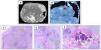 CT thorax (A and B – coronal section) showing a large heterogenous lung mass in the right hemithorax with focal areas of calcification (red arrow) and necrosis (green arrow), shifting mediastinum to the left. USG guided biopsy of the lung mass was done and the HE-stained images showed the chondrocytes arranged in small clusters, and singly in a lacuna (yellow arrows). There is moderate increase in cellularity with multinucleation, and mild atypia (C – 20×; D – 40×). Image E (40×) shows areas of calcification within the tumour (white arrow).