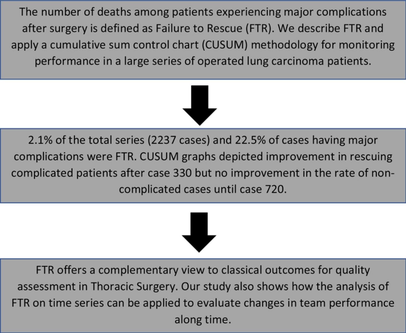 El fallo en el rescate (FTR, por sus siglas en inglés) se define por el número de muertes entre los pacientes que experimentan complicaciones graves tras la cirugía. En este informe analizamos el FTR y realizamos gráficos de control de suma acumulada (CUSUM, por sus siglas en inglés) para monitorizar los resultados en una serie de gran tamaño de pacientes operados de carcinoma de pulmón.