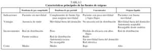 Las principales fuentes de oxígeno son el gas comprimido, el concentrador y el oxígeno líquido. Las características principales de cada uno se exponen en la tabla I.