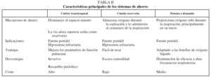 Con el objetivo de aumentar la autonomía de las fuentes de oxígeno portátiles mediante la disminución del gasto de oxígeno, a mediados de los años ochenta aparecieron los sistemas de ahorro. Los principales métodos disponibles actualmente son el catéter transtraqueal, las cánulas reservorio y los sistemas a demanda23. Dado que se admite que las cánulas nasales convencionales son un sistema ineficiente, pues sólo un 15-20% del oxígeno administrado participa en el intercambio gaseoso24, los sistemas de ahorro se concibieron para utilizar menos oxígeno, pero de una manera más eficiente. Así, se estima que pueden aumentar la autonomía de un pequeño cilindro hasta 3 veces más que con oxígeno continuo utilizando las gafas nasales convencionales25. Esto permite optimizar la administración de oxígeno, además de conseguir una mayor competitividad económica de las fuentes portátiles. En la tabla II se resumen sus principales características.