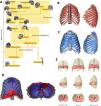 Morphological changes in the thorax throughout human evolution. (A) Schematic representation of the evolution of the genera Australopithecus and Homo, including some of their most representative species. (B) Superimposition of the 3D reconstruction of an adult H. ergaster thorax (KNM-WT 15,000, in red) onto that of a modern adult human using Procrustes registration. H. ergaster retains a conical-shaped thorax, characterized by a narrower upper portion and a broader and deeper lower portion. Adapted from Bastir et al. [12]. (C) Superposition of the Neandertal thorax (Kebara 2 male, in blue) and a modern human male specimen (in gray) in ventral and left lateral views. Although relatively similar in the upper hemithorax, the Neandertal ribcage is wider and deeper in its lower portion. Adapted from Gómez-Olivencia et al. [13]. (D) Superimposition in frontal and caudal views of Neandertal (in red) and modern human (in blue) ribcages and lung shapes. Adapted from García-Martínez et al. [15]. (E) Frontal, lateral, and cranial views of reconstructed ribcages and upper diaphragms of Homo ergaster (KNM-WT 15,000) and Neandertal (Kebara 2) specimens compared to the mean ribcage and upper diaphragm of an adult Homo sapiens reference sample. Adapted from López-Rey et al. [20].