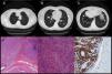 A-C) TAC torácica del LBM. D y E) Anatomía patológica de la biopsia pulmonar del LBM. F) Estudio inmunohistoquímico de desmina en la biopsia pulmonar del LBM.