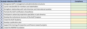 The Latin American Thorax Association (ALAT) is celebrating its 25th anniversary1. During this time, ALAT has become a fully established professional association that has concentrated its efforts and managed to fulfill most of the goals proposed in its strategic institutional plan for 2016–2020 (Table 1)2.