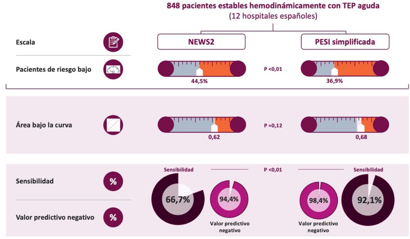 The aim of this study was to validate the NEWS2 score and compare it with the sPESI score in a cohort of hemodynamically stable patients diagnosed with acute symptomatic PE. As a secondary objective, we assessed the usefulness of NEWS2 compared to sPESI in the identification of patients with low-risk PE.
