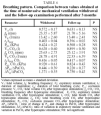 During the 3-month follow-up examination of the patients who were withdrawn from NPPV treatment, no significant changes were observed in weight (at follow-up: 99.4±16.4 kg), lung function test results (Table 4), daytime or nighttime arterial blood gases (Table 5), or oximetry (nighttime saturation parameters greater than 90% at the follow-up examination: 87.8±17.9%). There were no appreciable differences in breathing pattern or ventilatory response to hypercapnia. However, we did observe a tendency toward a diminished response to this chemical stimulus (Table 6).