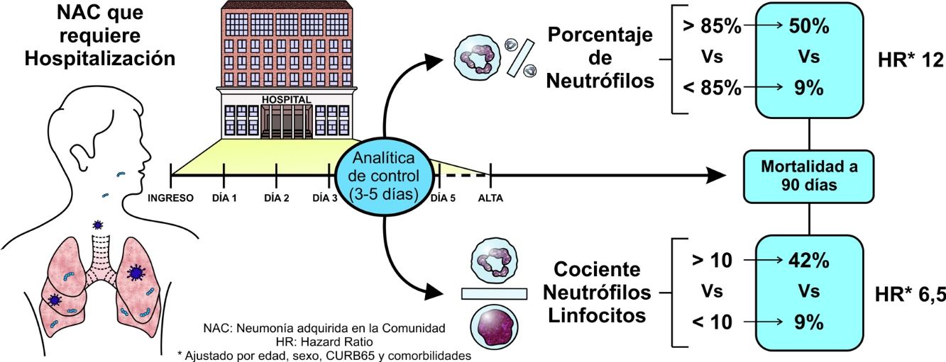 El objetivo de este estudio es evaluar la utilidad del NCP y el NLR medidos durante la evolución de la NAC, y su papel como predictores de mortalidad a 30 y 90 días.