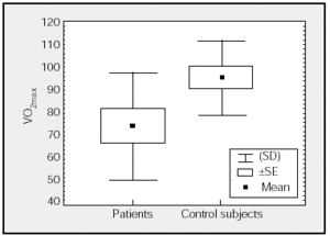 Figure. Comparison of maximal oxygen consumption (VO2max) (percentages) of patients and control subjects.