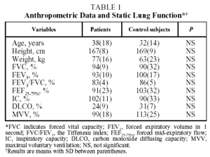 The results of lung function tests, PCET, and echocardiography were expressed as means (SD). To compare the results of anthropometric data, lung function tests, and PCET between patients and control subjects the Student t test for independent samples was used. A level of statistical significance with a probability value less than .05 (P<.05) was accepted. The results are presented in the tables and figure.