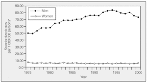 For women, the risk of dying of lung cancer before the age of 75 years, calculated from the cumulative rate, fell from 0.53% in 1975 to 0.46% in 2000. This means that at the beginning of the period studied 1 out of every 188 women died of this disease; by the end of the period this ratio had decreased to 1 out of every 215. The trend for men was somewhat different, with risk rising from 4.3% to 6.0% in the same period; 1 out of every 23 men died of this disease at the beginning of the period, and 1 out of every 17 at the end.