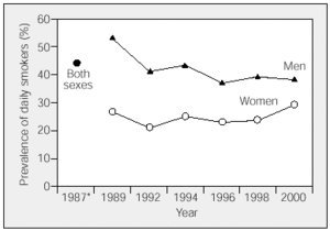 Figure 2. Prevalence of daily smokers by sex (Andalusia, 1987-2000). *For 1987 the variable of tobacco consumption was not analyzed by sex.
