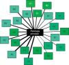 Representación gráfica de las relaciones entre una entidad principal (centro) y diversas comorbilidades potenciales (recuadros de la periferia). El grosor de las líneas entre uno y otros expresa la cantidad de información disponible en cada caso, tras el curado de los datos seleccionados automáticamente. Estas relevancias relativas se han ordenado según rotación horaria. Las comorbilidades de un mismo sistema o aparato del organismo se muestran con un patrón común en el relleno de los recuadros y como letra correlativa de identificación.