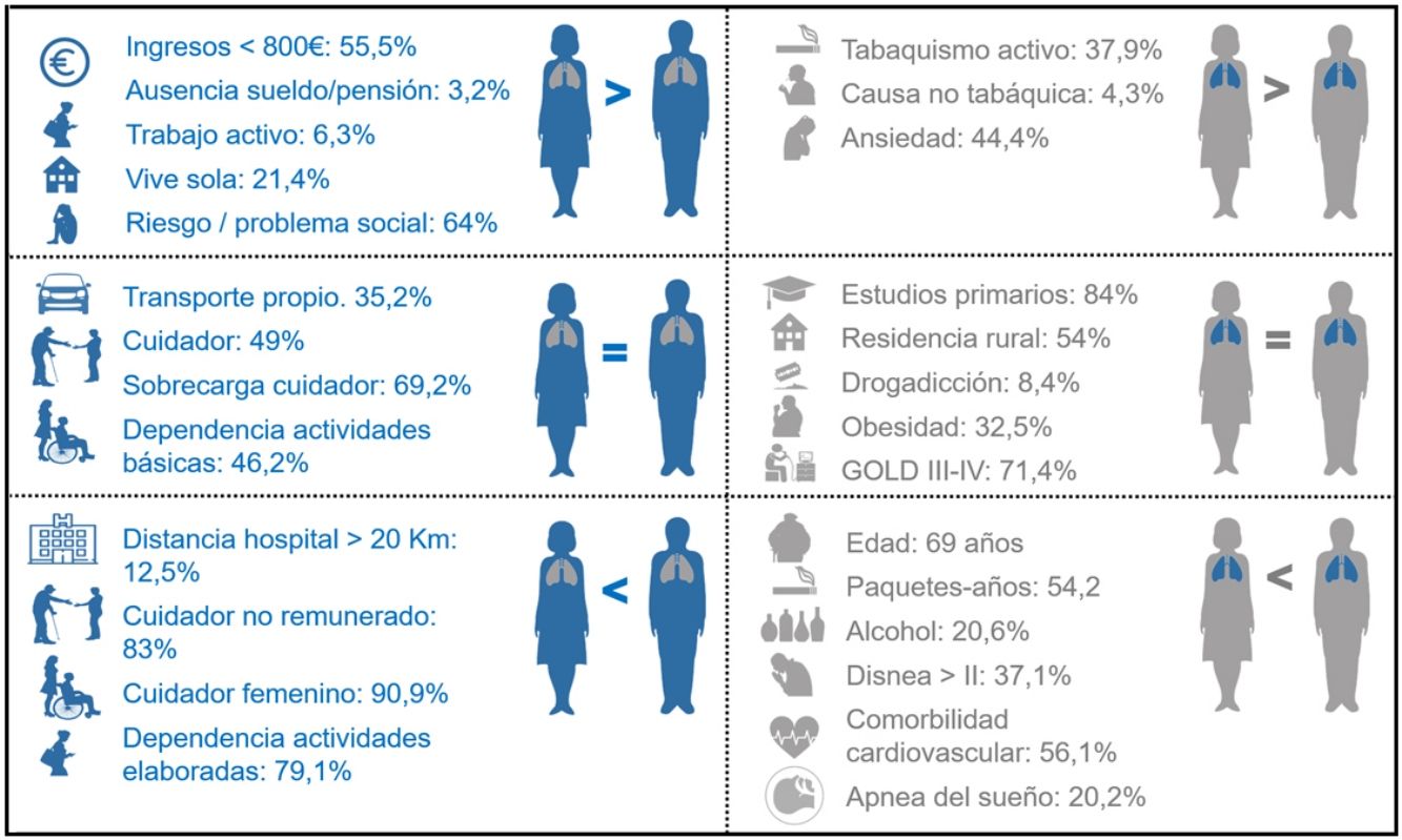 Al compararlas en función del género, las mujeres son más jóvenes, la EPOC es de causa no tabáquica más frecuentemente, con un número de paquetes-años menor, fuman más activamente y beben menos de forma excesiva. A pesar de un FEV1 similar presentan un menor grado de disnea, comorbilidades cardiovasculares y apnea del sueño. Existen diferencias sin alcanzar significación estadística en un mayor grado de ansiedad y menos diabetes.