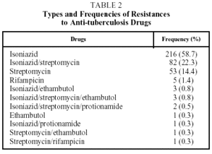 The normal procedure at the centers is to obtain 3 sputum samples from each patient for microscopic examination and diagnosis and a monthly sample during treatment and to grow a culture on the first sample and repeat the process during treatment every time the microscopic results are negative. Microbes are cultured on Löwenstein-Jensen medium and recoveries of mycobacteria are confirmed by microscopic examination. When a culture is positive with more than 10 colonies present after 6 weeks of incubation, it is tested for susceptibility to H, streptomycin (S), R, ethambutol (E), and protionamide (Pt) using the proportion method.6 The critical concentrations of drugs that differentiate the susceptible bacilli from the resistant ones are as follows: for H, 0.2 µg/mL; for S, 4 µg/mL; for R, 40 µg/mL; for E, 2 µg/mL; and for Pt, 40 µg/mL.