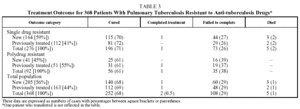 The objective of the present study was to establish the prognosis of pulmonary TB patients with any kind of resistance except MDR who live in a city in a very poor country but who receive treatment in an institution with exceptional resources not available to patients in other similar areas: second-line anti-TB drugs and a laboratory that grows cultures and performs susceptibility studies systematically on all patients.